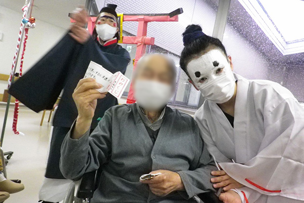 新しい年を迎えるため、毎年恒例の栗詣でを行いました。神主や巫女さんに扮した職員が皆様をご案内し、おみくじも引きました!笑いあり、真剣な祈りありで、新たな始まりに向けて明るい表情の皆様でした。