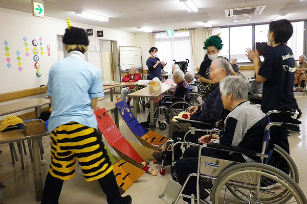 今回の豆まきも楽しさと活気にあふれた行事となりました。鬼の形を模した置物にお手玉を投げつけて倒します。力いっぱい投げて厄を払いました!!職員も工夫した節分の装飾や仮装を身にまとい盛り上げに奔走しました。