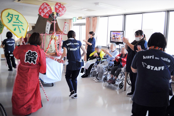 「暑さを吹き飛ばせっ!!」と勢いよく夏祭りを開催しました。皆様で輪になって盆踊りを踊り、とても楽しそうな表情でした。職員が汗だくになりながらの「栗の郷お神輿」のお披露目時には拍手喝采で大盛り上がり!アンコールにもお応えしました。
