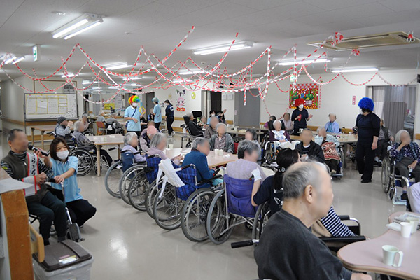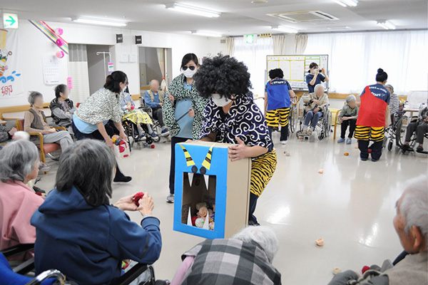 今回の豆まきも楽しさと活気にあふれた行事となりました。鬼の形を模した置物にお手玉を投げつけて倒します。力いっぱい投げて厄を払いました!!職員も工夫した節分の装飾や仮装を身にまとい盛り上げに奔走しました。